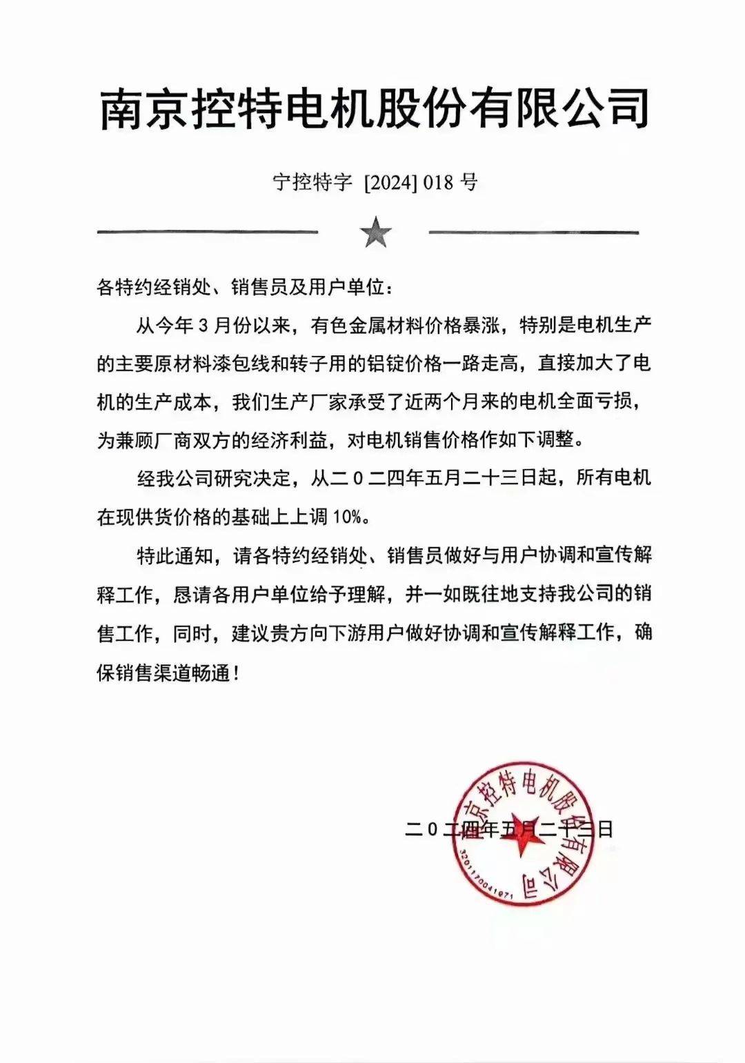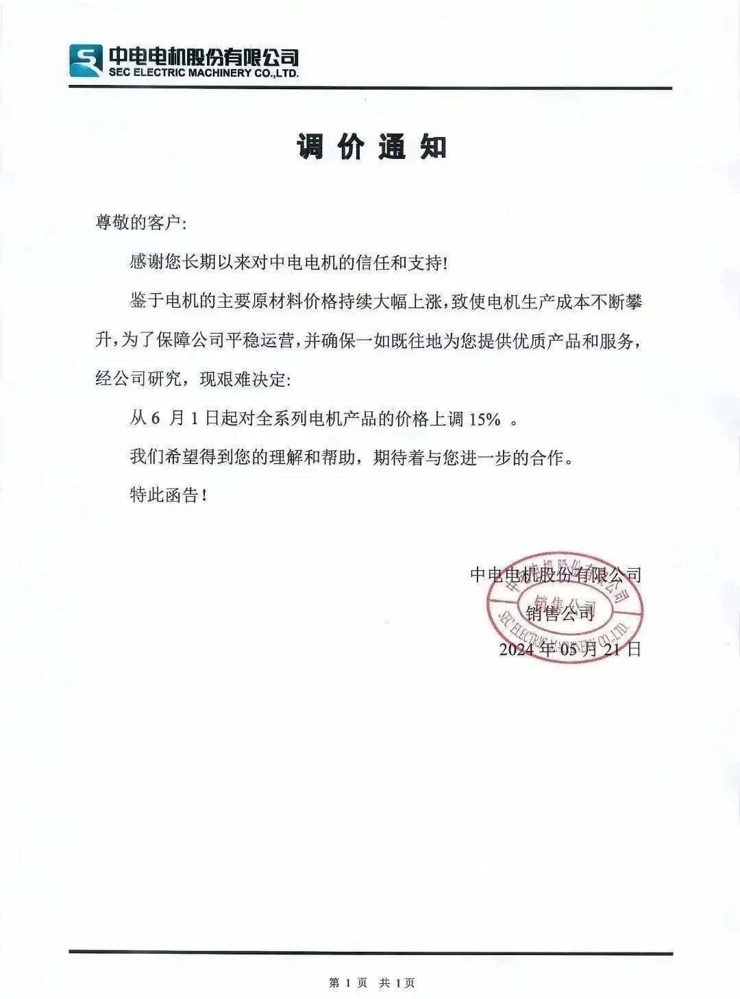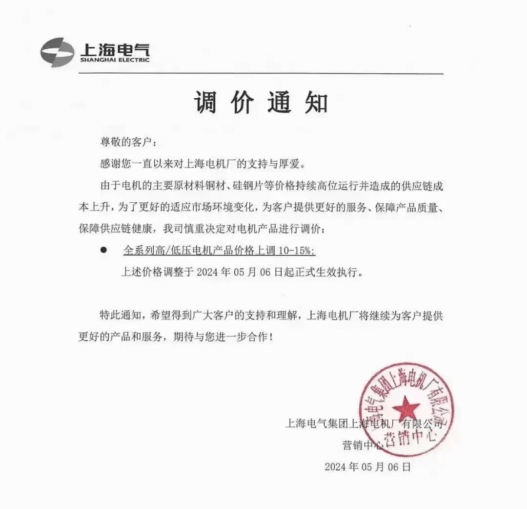近期,多家電機頭部企業接連發出漲價通告,像上海電氣上海電機廠有限公司與中電電機之外的其他一些電機企業,仿若提前達成一致般,均有著 10%左右的漲幅。