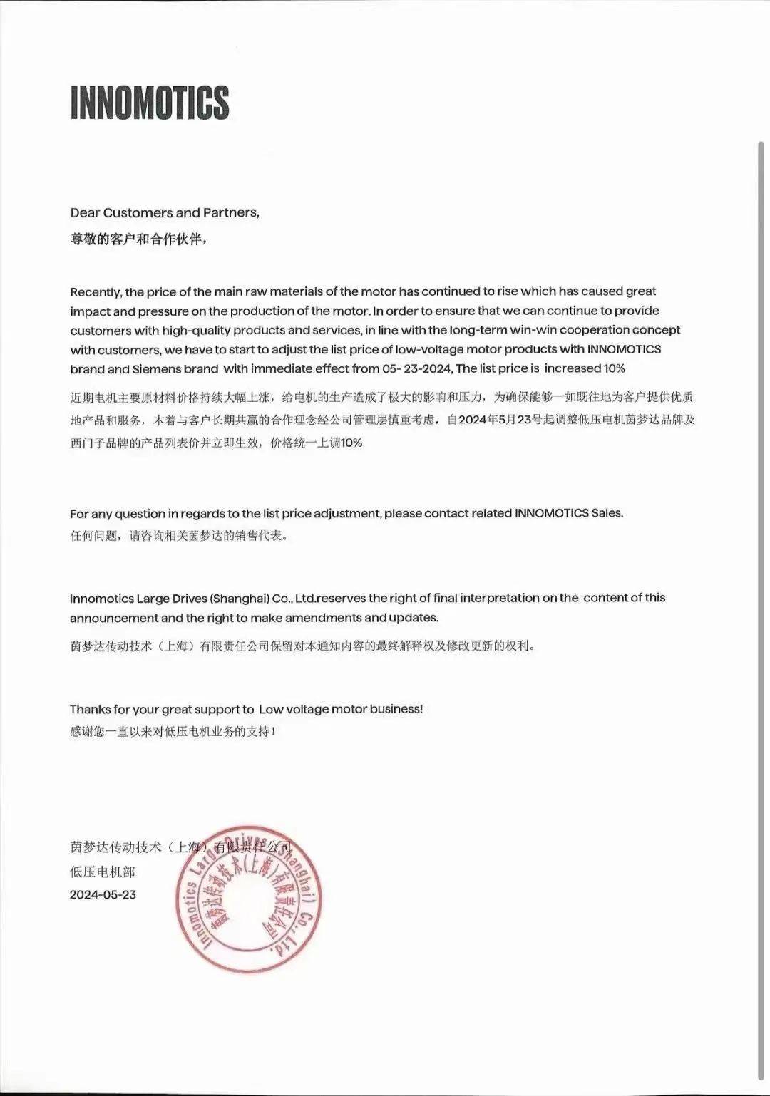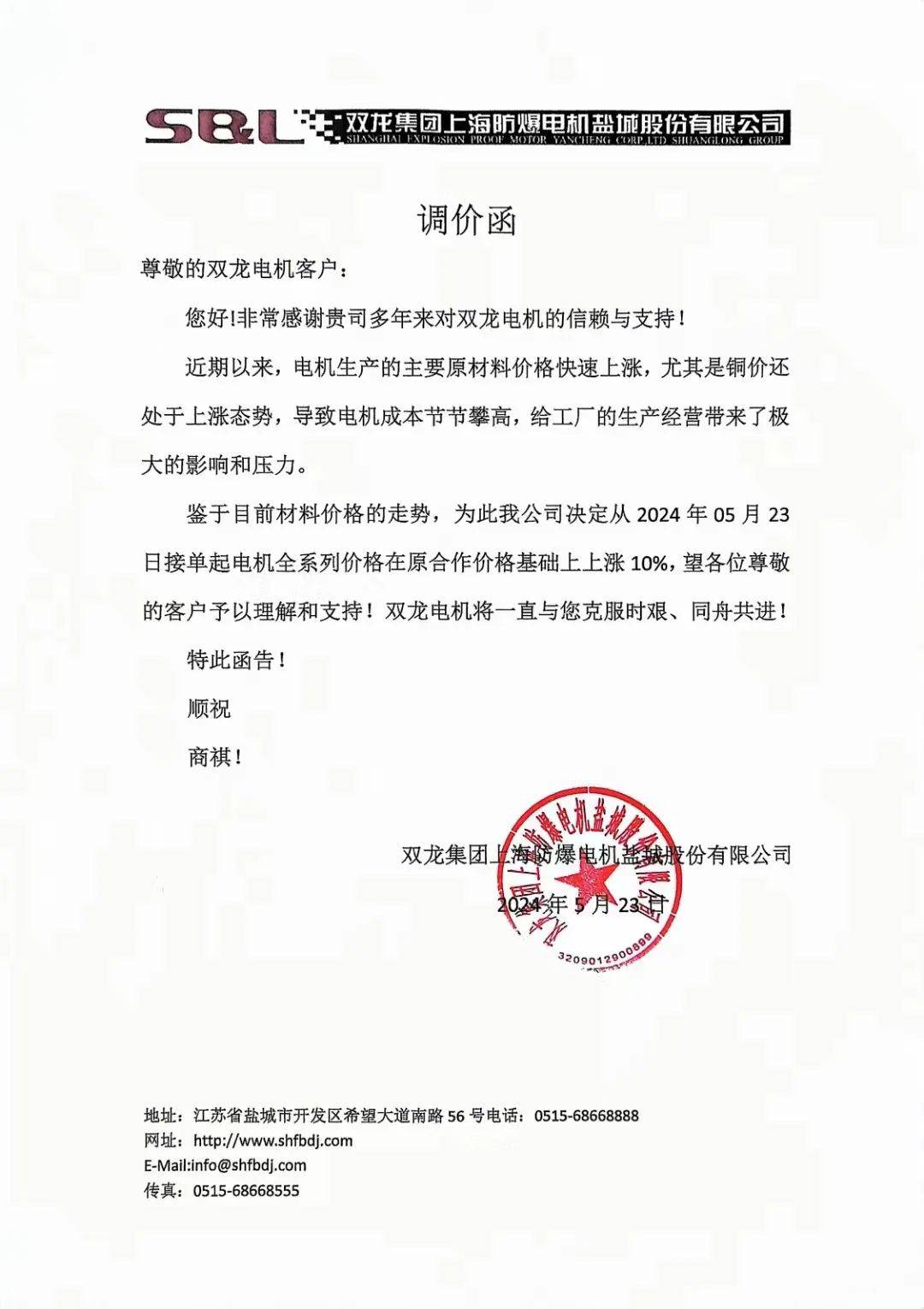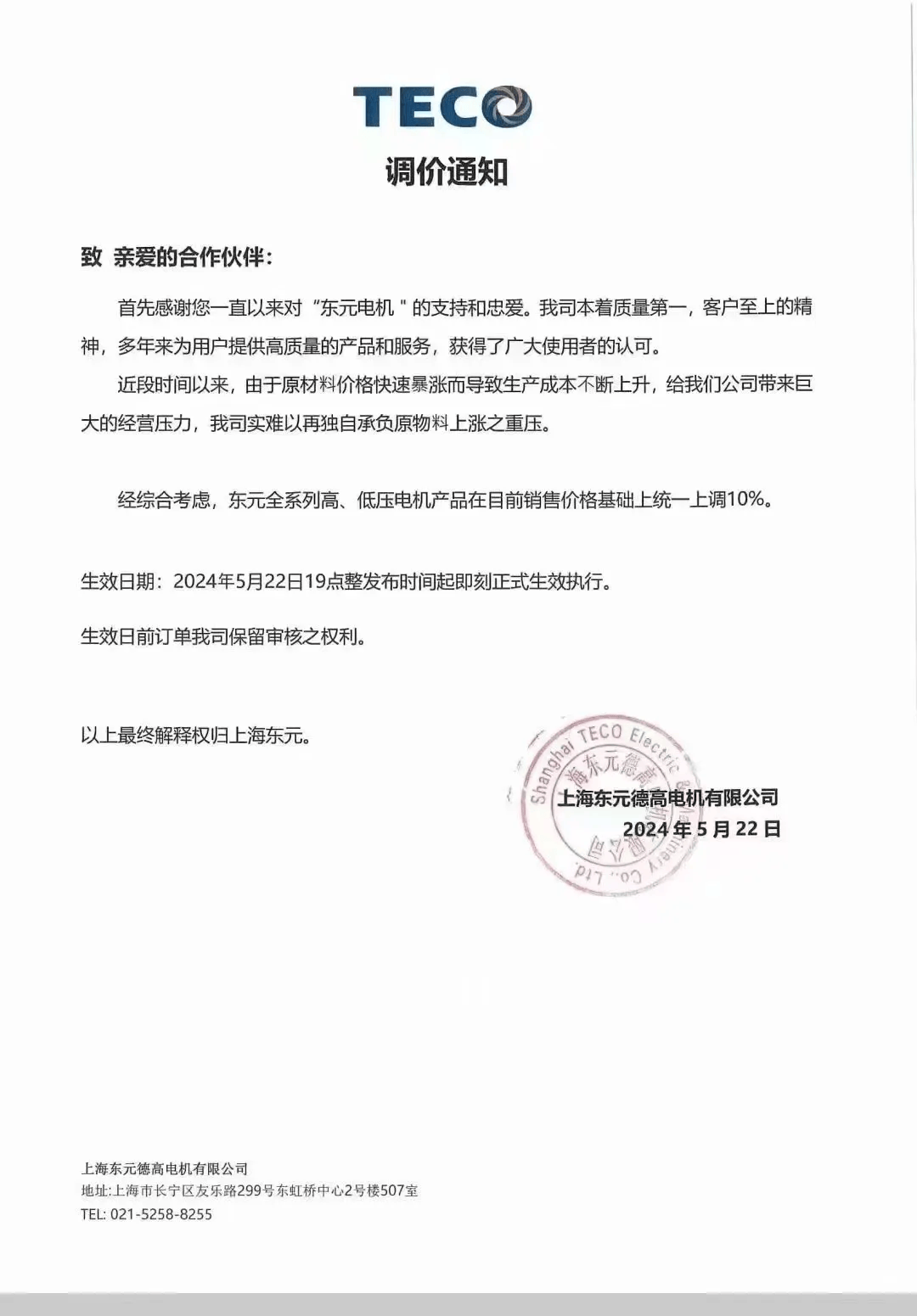 近期,多家電機頭部企業接連發出漲價通告,像上海電氣上海電機廠有限公司與中電電機之外的其他一些電機企業,仿若提前達成一致般,均有著 10%左右的漲幅。