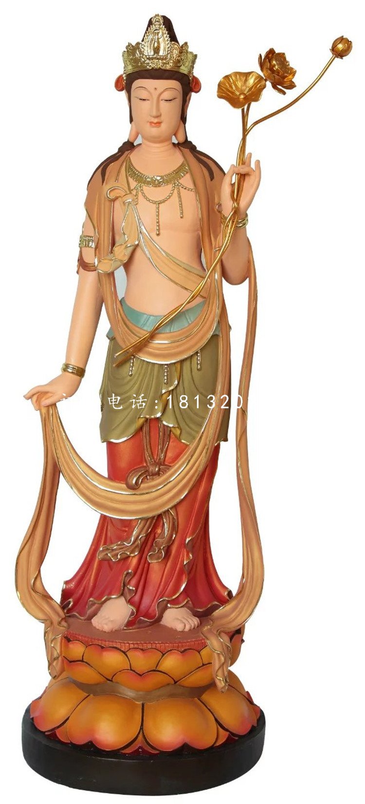 大勢至菩薩,又稱得大勢菩薩或大精進(jìn)菩薩,簡稱為勢至。大勢至是梵文Mahās-thāmaprāpta的意譯。音譯為"摩訶那缽"。據(jù)《悲華經(jīng)》卷二稱,刪提嵐世界的無諍念王有一千個(gè)兒子,長子名不眴,次子名尼摩。后無諍念王成佛為阿彌陀如來,不眴太子為觀世音菩薩。而尼摩太子則成了大勢至菩薩。菩薩跟隨佛學(xué)法修菩薩行,經(jīng)過許多階段之后,才可成佛。菩薩中經(jīng)歷所有的階段達(dá)到最高位的菩薩,就是一生補(bǔ)處菩薩。只要結(jié)束菩薩生涯,在下一階段的生涯中就定可成佛。若以三尊的形式表現(xiàn)佛陀時(shí),必有一生補(bǔ)處菩薩隨侍左右,且組合是一定的。阿彌陀佛其左右脅侍的就是觀世音菩薩和大勢至菩薩,三位合稱"西方三圣"或"阿彌陀三尊"。