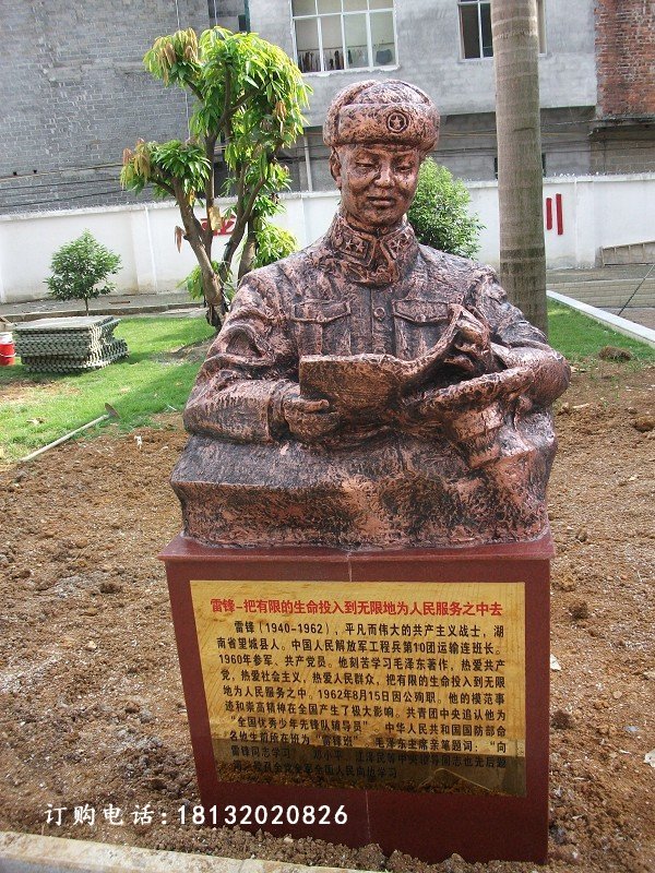 雷鋒出生于湖南省長沙市望城區一個貧苦農民家族的雷鋒有著不堪的經歷,年僅7歲的雷鋒淪為孤兒,于9歲結束了痛苦的生活,他得到黨和人民政府的關懷參加了兒童團,進小學讀書識了字,畢業后參加工作期間都被評為模范,他工作期間無論到哪個部門或工廠都盡心盡力的工作,雖然雷鋒一生只經歷了21個花開的季節,但是他的模范事跡和高尚思想卻在軍內外產生著巨大的影響,中華為民共和國國防部為其生前所在班為雷鋒班,而雕塑廠家就為其塑造了人物雕塑讓人緬懷紀念,讓其英雄事跡永垂不朽。同時,雷鋒的英雄事跡和無胃的付出得來的是人們永遠的懷念和學習,不僅為其塑了人物雕像,更應其故事編排成了歌謠、電影、電視劇、動畫片等。