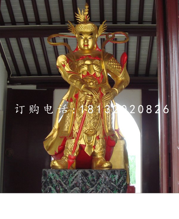 韋陀是佛的護法神。據說,在釋迦佛入涅時,邪魔把佛的遺骨搶走,韋陀及時追趕,奮力奪回。因此佛教便把他作為驅除邪魔,保護佛法的天神。從宋代開始,中國寺廟中供奉韋陀,稱為韋陀菩薩,常站在彌勒佛像背后,面向大雄寶殿,護持佛法,護助出家人。因此在人們心中韋陀菩薩占有十分重要的地位。