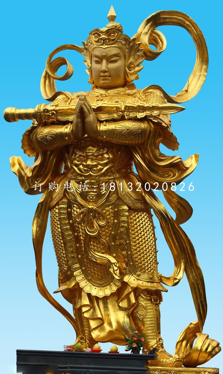 韋駝菩薩現天大將軍身,擔當佛教中驅除邪魔,保護佛法的重任,為佛教中護法金剛力士的代表之一相傳,浙江臨安天目山是韋馱菩薩的道場。