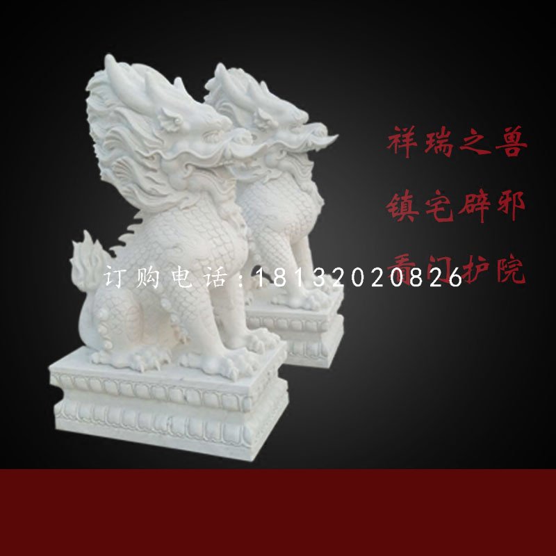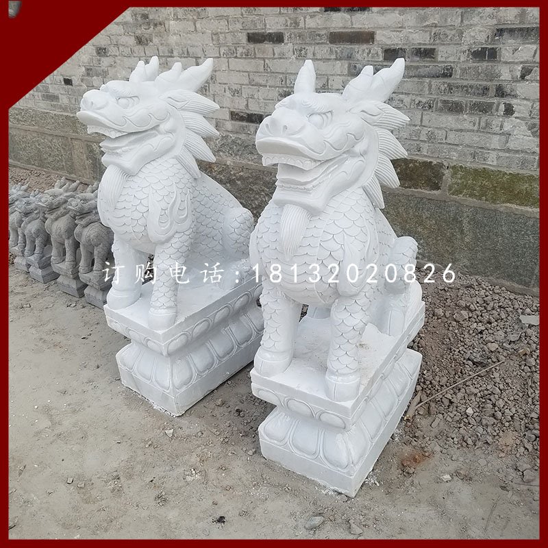 石雕麒麟是漢族工藝品之一。漢族民間認為麒麟有鎮宅辟邪,增添家中吉祥的作用。用優質天青墨玉、霞玉、緬甸玉、漢白玉、墨玉、佘太玉、砂巖、大理石、花崗石、銀灰白石、雪花白等石材玉料的石雕麒麟。麒麟是古代的仁獸,集龍頭、鹿角、獅眼、虎背、熊腰、蛇鱗、馬蹄、豬尾于一身,乃吉祥之寶,從古到今都是公堂上的裝飾,以振官威之用,也是權貴的象征。