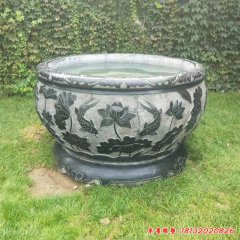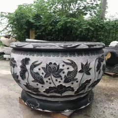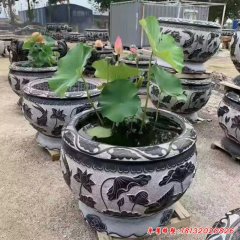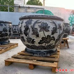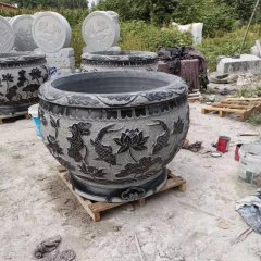 荷花鯉魚石浮雕水缸,青石仿古水缸