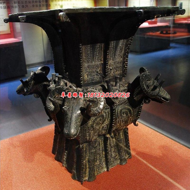 四羊方尊是商朝晚期偏早的青銅器,屬于禮器,祭祀用品,整體高58.3厘米,重近34.5公斤,器身方形,方口,大沿,頸飾口沿外侈,四邊上裝飾有蕉葉紋、三角夔紋和獸面紋。尊的中部是器的重心所在。尊四角各塑一羊。肩部四角是四個(gè)卷角羊頭,羊頭與羊頸伸出于器外,羊身與羊腿附著于尊腹部及圈足上。尊腹即為羊的前胸,羊腿則附于圈足上,承擔(dān)著尊體的重量。
