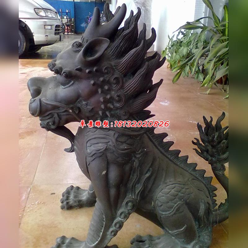 銅雕麒麟是一種聚財(cái)鎮(zhèn)宅神獸,高大,神異非凡。銅雕麒麟頸軀修長(zhǎng),四肢跨度極大,顯得體勢(shì)異常高聳、勁健而迅猛。銅麒麟長(zhǎng)須下垂,雙目圓睜,胸部突出,臀部肥大,獸尾自然卷曲至底座處,腳爪前后分置,整個(gè)身軀作s型扭動(dòng),顯得勇武大方。銅雕麒麟長(zhǎng)須、批毛和雙翼進(jìn)行了高度的裝飾化處理,雕刻有華麗的花紋,使銅麒麟神異非凡的氣質(zhì)得到了進(jìn)一步的表現(xiàn)。