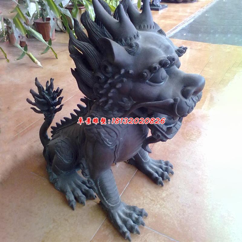 麒麟,中國古代神話傳說中的一種神獸,也是仁獸。銅雕麒麟首似龍,形如馬,狀比鹿,尾若牛尾,背上有五彩毛紋,腹部有黃色毛,麒有獨角,麟無角,口能吐火,聲音如雷,麒麟的這些形象是把那些備受人們珍愛的動物所具備的優點全部集中在麒麟這一幻想中的神獸身上。