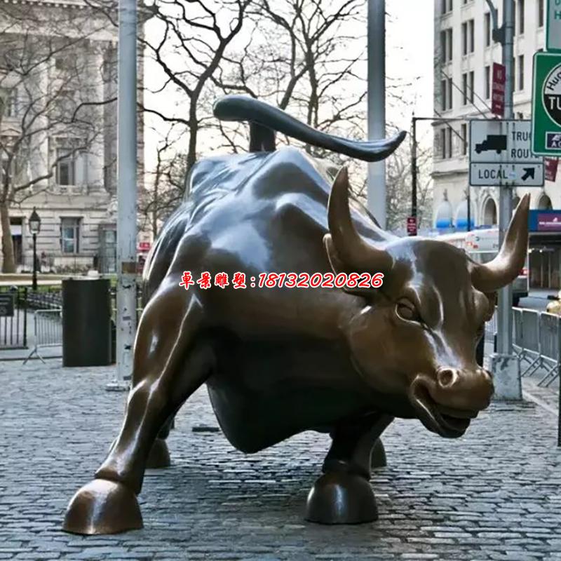 華爾街銅牛是美國華爾街的標(biāo)志,1989年鑄成并安放在紐約證券交易所門前,最后被搬到與華爾街斜交的百老匯大街上。它是力量和勇氣的象征,寓意著只要銅牛在,股市就能永保牛市。銅牛的設(shè)計者,來自意大利西西里島的藝術(shù)家莫迪卡,想做一件作品一鳴驚人,于是開始構(gòu)思并制作了這尊銅牛。他也因為銅牛的問世而真的聞名遐邇了。世界上很多金融中心、股票交易市場都紛紛模仿,雕塑了一尊尊銅牛。而且,模仿中也不乏創(chuàng)新之作。這些新塑的銅牛也是各有特色,有的奔馳疾駛,有的仰首沖天,有的持高傲物。在人們的想象中,留住了銅牛,也就是留住了財富。于是有的人還把銅牛用鐵鏈鎖住,希望它永遠(yuǎn)駐留此地,效忠主人。